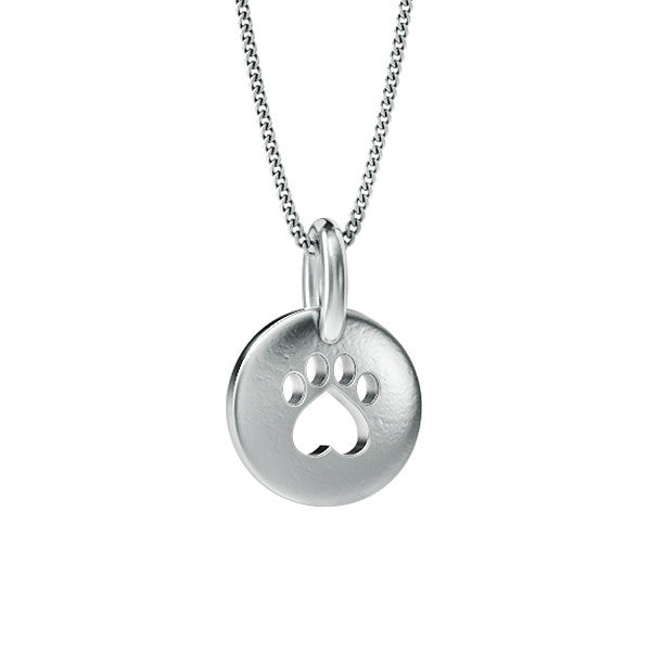 This adorable Bella Mini Paw Print Pendant is made of Sterling Silver or 14k Gold. The Sterling Silver has a lightly hand burnished oxidized finish. The 14k gold versions are polished to a high shine.The Pendant features a cute paw print cutout. This little Bella Mini Paw Print Pendant has excellent detail. Great for all the Dog, Puppy, and Pet Lovers. The pendant is about 10mm wide.
